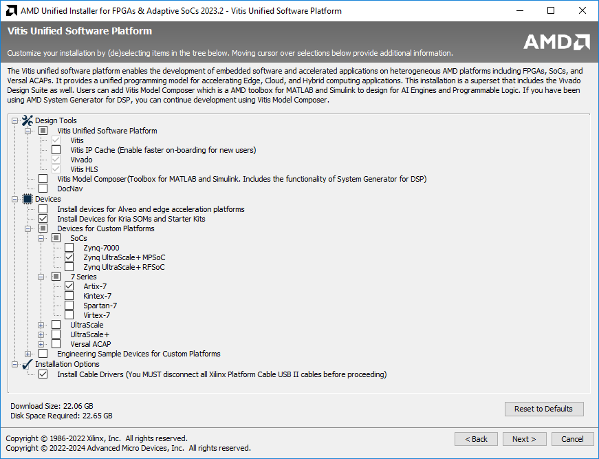 Do the selection as given in the screenshot below. Must haves are Vitis, Vivado, Vitis HLS, Install Devices for Kria SOMs and Starter Kits, Zynq UltraScale+ MPSoC, Install Cable Drivers.