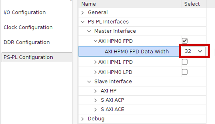 In the PS-PL configuration, we can choose AXI HPM0 FPD and uncheck AXI HPM1 FPD. Using AXI HPM0 LPD is also ok (FPD = full power domain. LPD = low power domain). This is the master AXI interface, to which the slaves created in PL will be connected. Select the data width as 32.