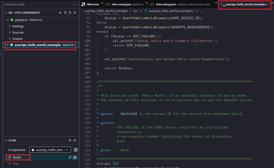 In the next screen, select xuartps_hello_world_example. You will now see the application project in the workspace.