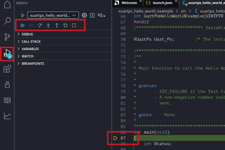 You can also click Debug, and then the standard VS Code debugging options become available. The screenshot shows the program suspended at the beginning. You can set single step, set breakpoints (double click to the left of the line number), run until breakpoint, step into functions, etc. It is a good idea to stop using the red stop button before starting a fresh Run/Debug.