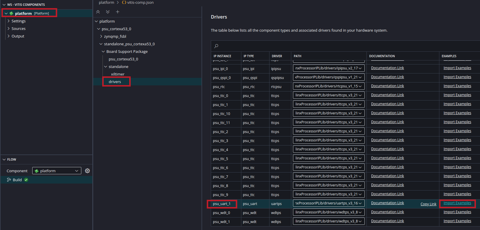 You can import examples for the various peripherals. For a start, we can run an example program for psu_uart1, which is the peripheral we will be using for basic input/output (and will interact with the serial terminal/console program, e.g., RealTerm).